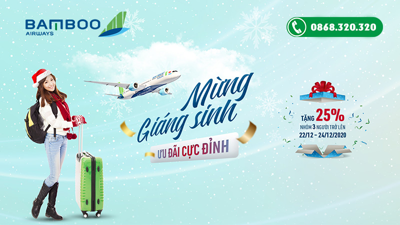 Bamboo Airways thay ông già Noel gửi tới quý khách hàng những MÓN QUÀ ĐẶC BIỆT, ưu đãi cực đỉnh GIẢM NGAY 25% khi đặt vé cho nhóm 3 người trở lên.